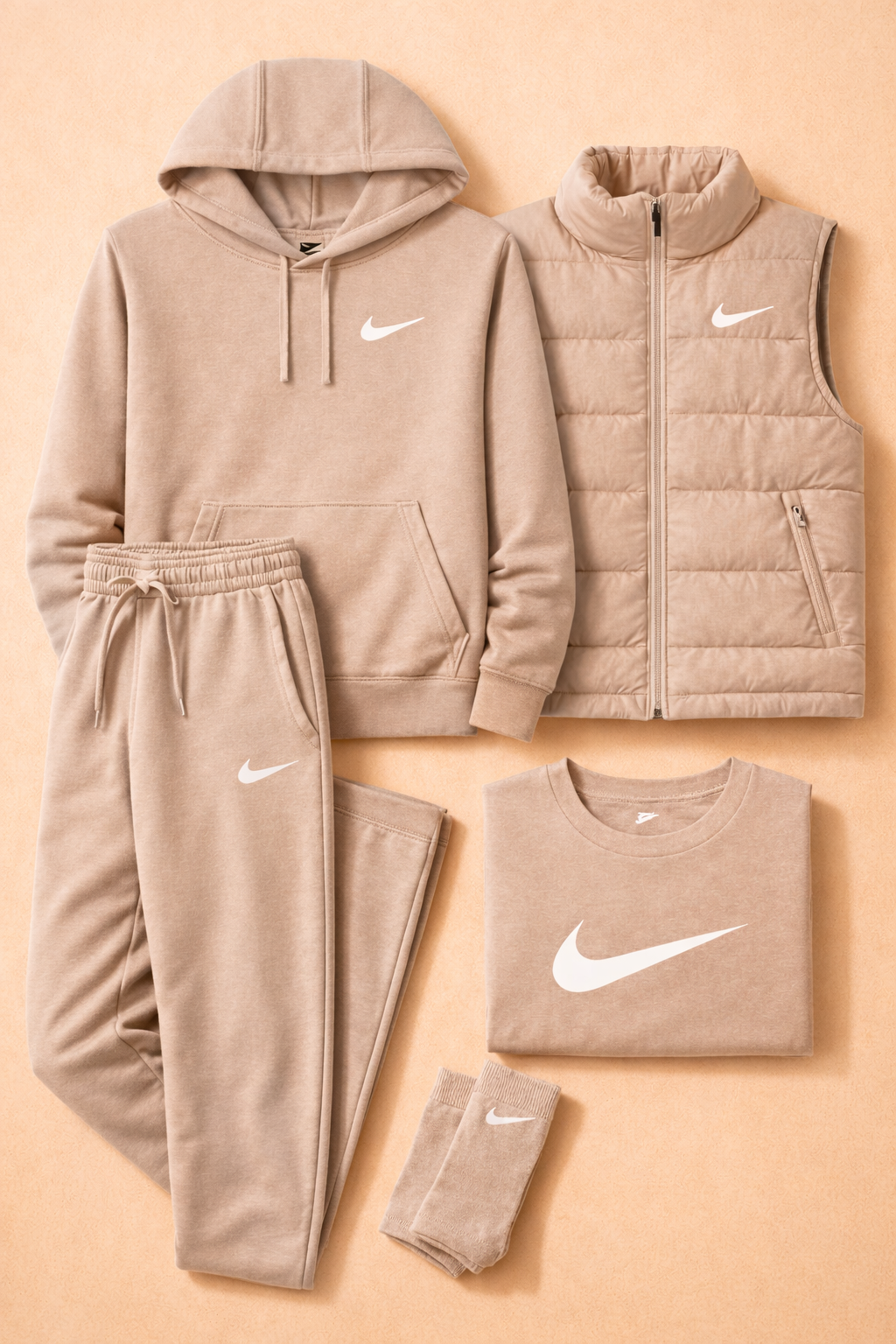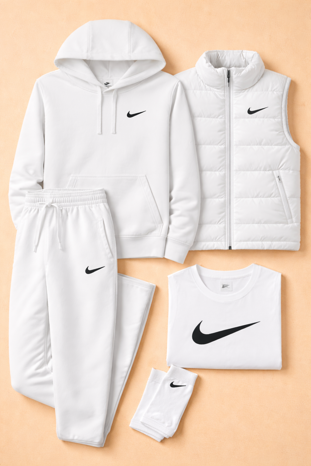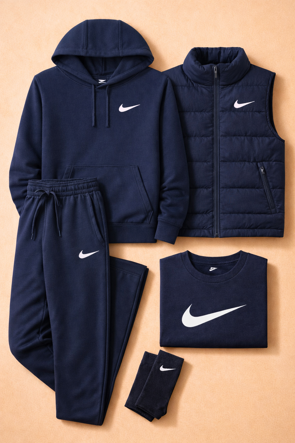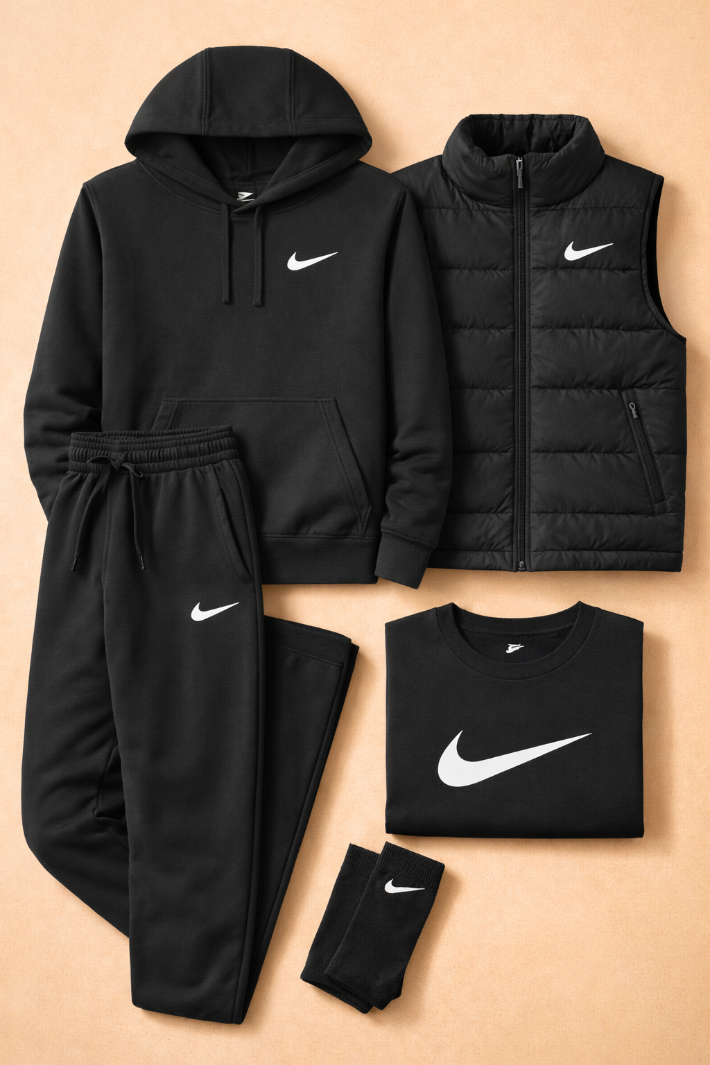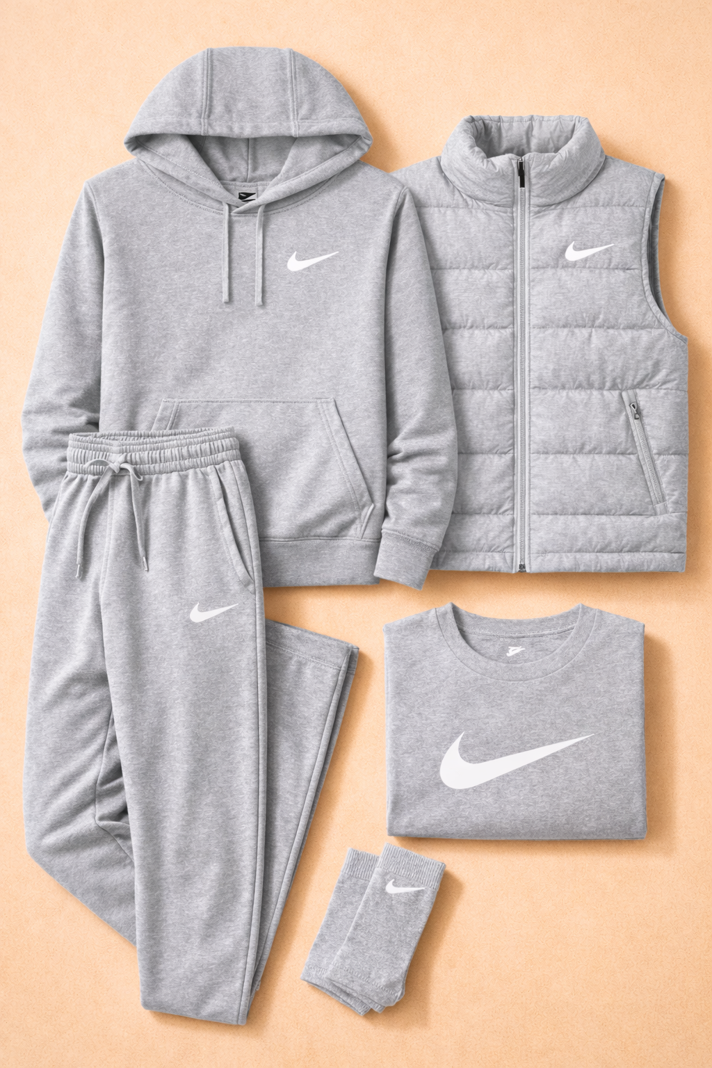 The Essential Layered Kit combines comfort, style, and versatility in a single coordinated set designed for everyday life. Featuring a hoodie, T-shirt, joggers, a padded sleeveless top, and matching socks, this kit offers a clean, modern look perfect for any season. The soft, durable materials ensure a comfortable fit, while the minimalist design with the iconic Swoosh adds a sporty, contemporary touch. Ideal for a complete outfit that combines functionality and urban style.